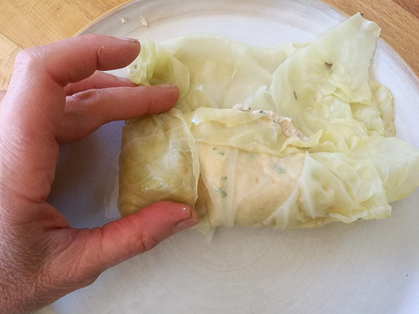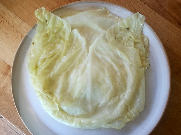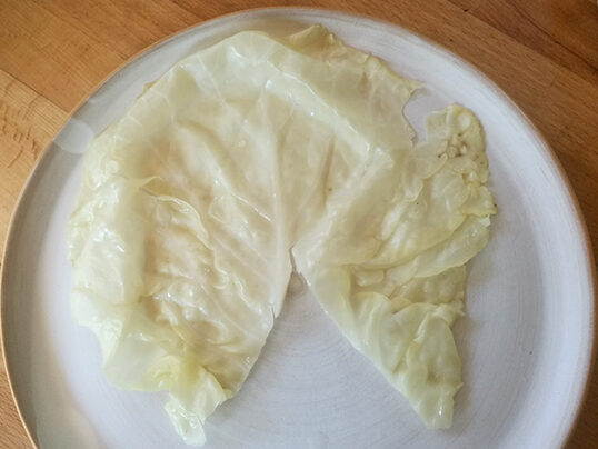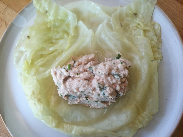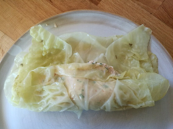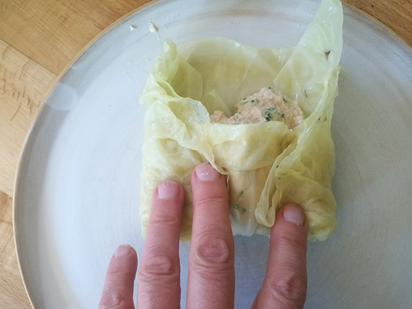 Étaler une première feuille de choux sur une assiette, puis poser l’autre dessus tête bêche. Partager la farce et la placer au centre des feuilles. Rabattre la moitié des feuilles sur la farce vers l’avant, puis rabattre chaque coté et finir en roulant les feuilles vers l’avant pour recouvrir les côtés (voir le tuto ci-dessous). Réserver au frais et présenter le ravioli posé sur son ouverture.